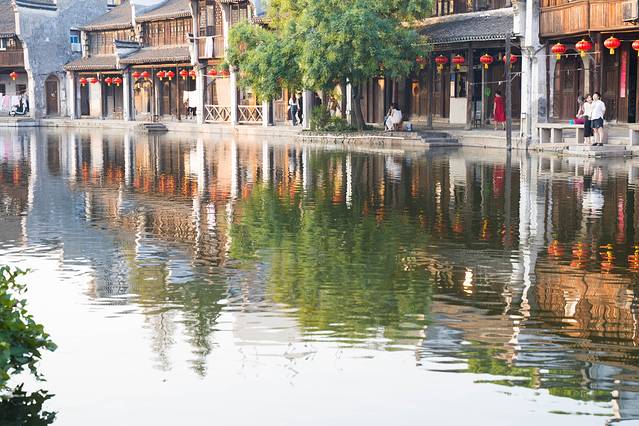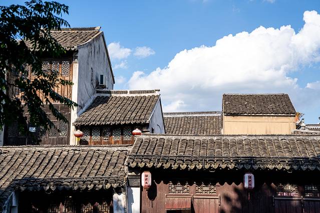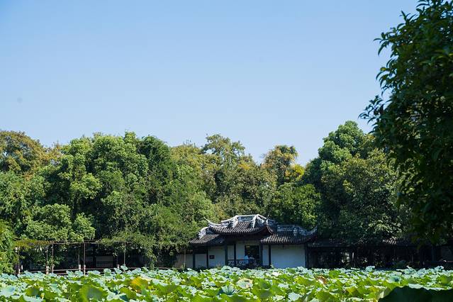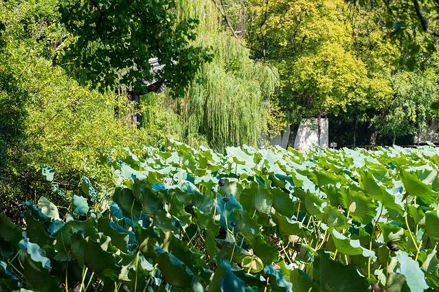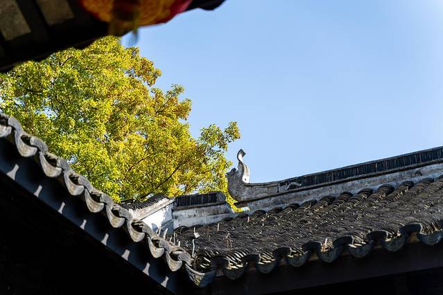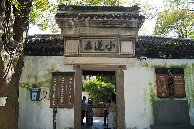 从古镇的正门进入景区,第一个景点便是小莲庄,走进小莲庄,这个院落在古镇里已算大的。穿过廊桥亭榭映入眼帘的便是一片硕大的荷塘,此时虽然早已没了粉色的荷花,但碧绿的荷叶依旧是遍布整个池塘。远处蓝色的天空,近处朱砂色的木门,抬头望去是灰色的檐角,一切都是江南的颜色。