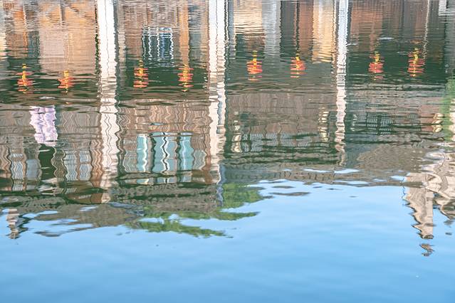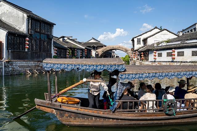 摇橹船带起的阵阵涟漪让倒映着岸上的画面更加斑斓