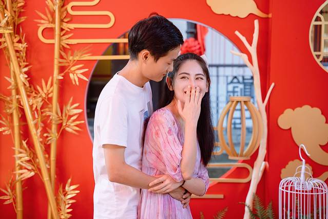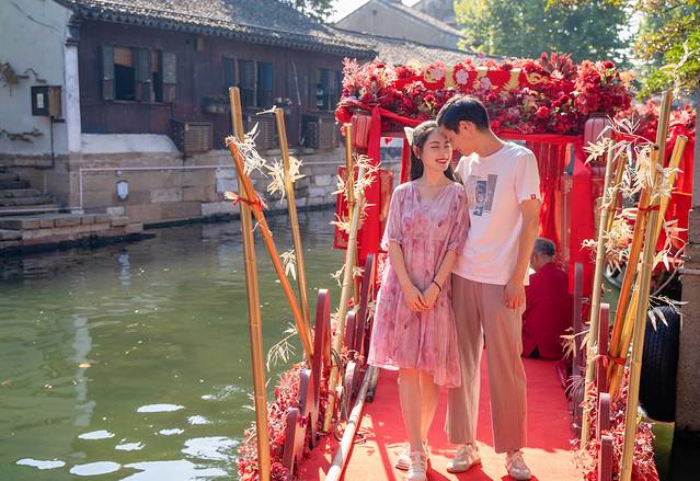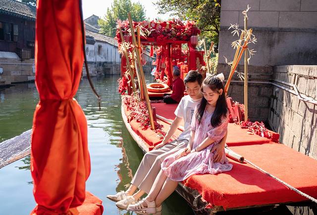 经典的喜字贴在窗上,火红的灯笼悬挂在两旁,就连摇撸船也都被精心的布置了一番,如若和我们一样是情侣出游,那么湖丝馆真的非常适合情侣打卡拍照,每一处布景,都可以留下无比甜蜜的美好回忆。