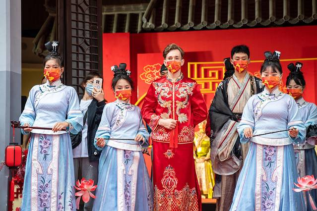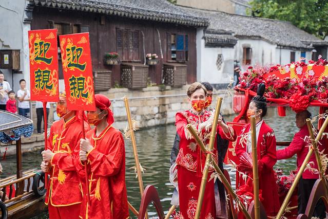 吉时已到,伴随着喜庆的音乐,这场无比热闹的水上婚礼演出便拉开了帷幕。未曾让我想到的是,这次参加水上婚礼的新人居然是一对外国情侣,金发碧眼的外国人遇到中式古典的中国婚礼,到底会碰撞出怎么样的火花呢?真的是让人觉得无比的新奇与有趣。