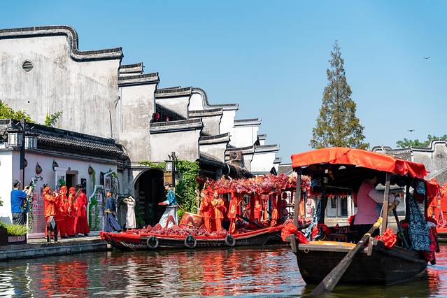 南浔觅烟雨,水乡定三生,国庆演艺节目最不能错过的便是水乡婚礼了,水乡婚礼延续了南浔旧时的婚礼形式,将独属于南浔的民俗民风以实景演出的形式呈现在游客的眼前。