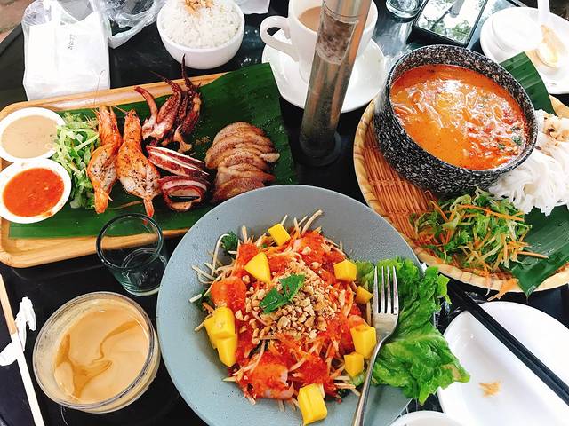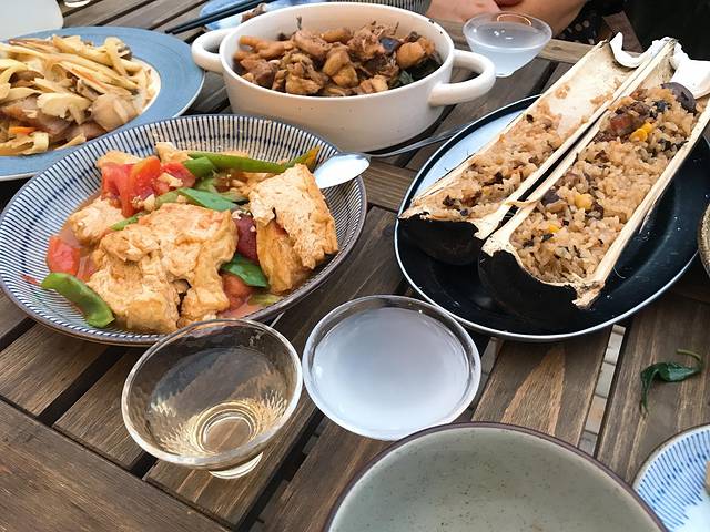 点了个套餐,有竹筒饭,野菜,豆腐,笋烧腊肉什么的,还有米酒和红茶,米酒很清甜好喝,不算酒,就是酒酿饮料。这些菜在当地算烧的不错的,套餐两百多也不贵。但后来我们在平安寨吃到更好吃的。