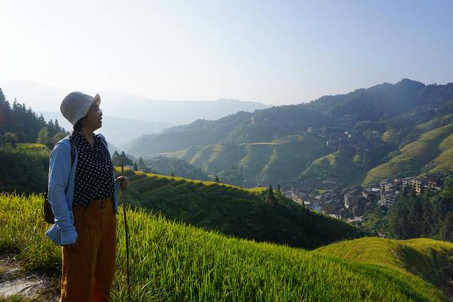 而我爸妈就走去象鼻山景区了,也就一公里路,酒店位置真的很好,去哪里都方便。他们去看了下地标性景点,还和当地奶奶聊了天。差不多同时我到酒店,他们也回来了。准备出去吃个饭就租车出发去龙脊梯田。