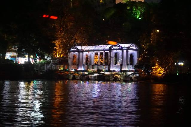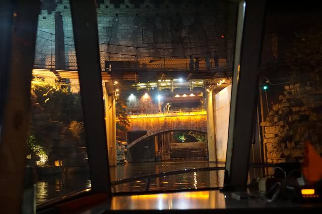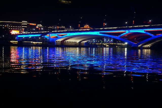 坐船游览夜景,看各种桥,经过两个水阀门,升降梯,最好看的就是日月双塔。