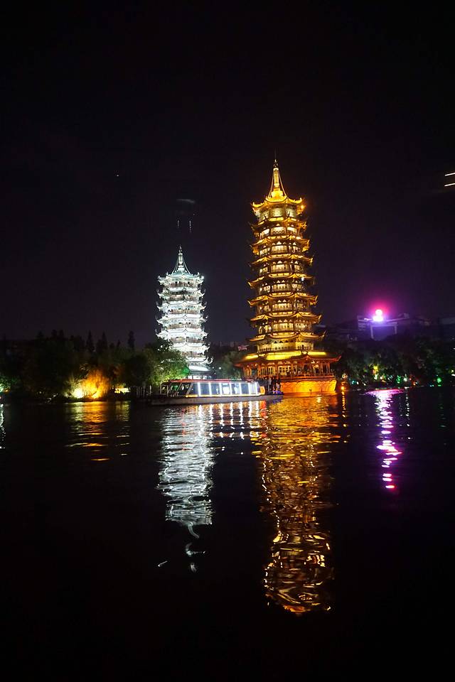 晚上急匆匆,要提早到象山码头,从靖江王府出来已经6点,7点45的船票,要7点15就到。还好酒店门口就是美食街,找了家弄堂里的米粉店,每个人吃了一碗桂林米粉。就回去收拾下东西,走去码头。两江四湖夜游更好看,也更贵,找了旅行社190一个人,位子很好,在第一排无遮挡。
