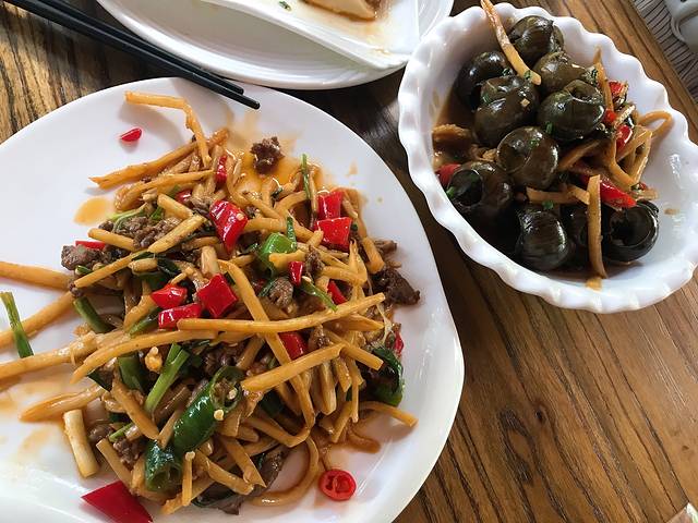 昨晚阳朔西街后决定要这家吃,江景只有一点点,但是点评说饭餐很好吃。边上还有故居啥的,没开。漓江现在也没水,但是总归有江景好看。店里有套餐很划算,但是住店客享受,外面来吃饭的就是单点。我们点了几个菜,都不踩雷,好吃,田螺酿我吃了很多,就是酸笋牛肉真的太辣了。