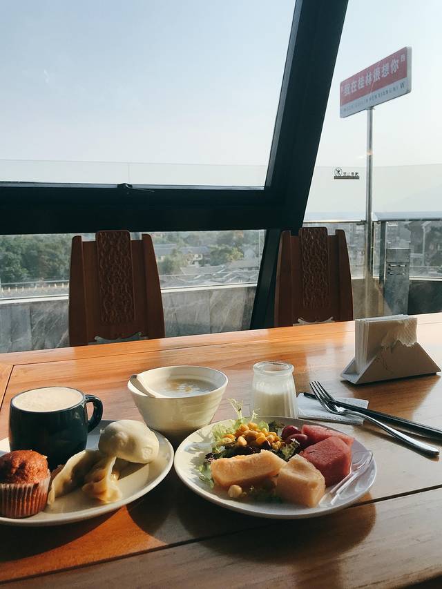 这家酒店极力推荐,有接送机服务,虽然不免费,但是50元一次比自己打车便宜,而且省力。地理位置就在靖江王府边上,东西巷边上,走路能到市区内几乎大部分主要景点。而且服务态度极好,我刚好生日,送了我多一份下午茶,所以三个人刚坐上酒店叫的接机车子,到了酒店,放好行李,就去9楼顶楼喝下午茶,刚好当中饭。下午茶很丰富,比早餐还多,完全能够吃饱,粥、披萨、水果、糕点、米线。