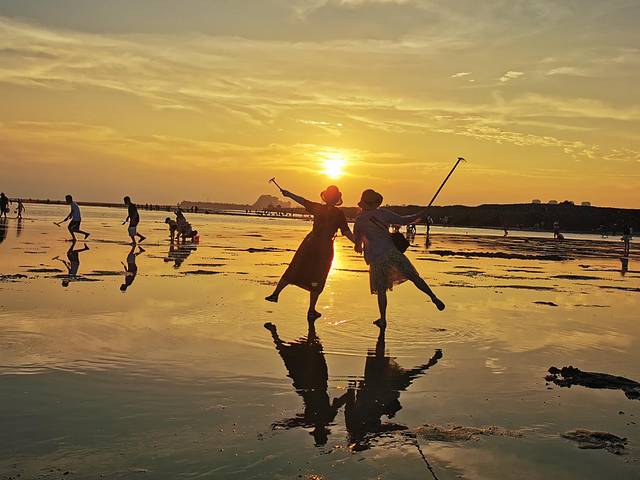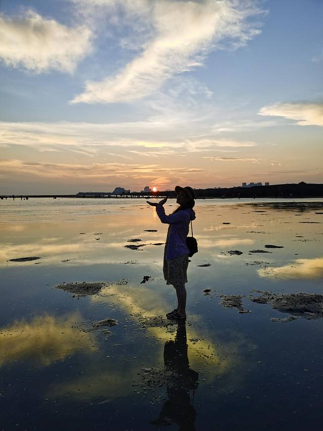 到改回去的时候,原计划去银滩看落日的。但是6点回到岸边,6点半日落来不及,就在赶海滩上看,也好美。