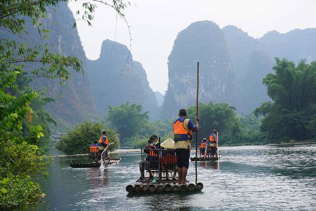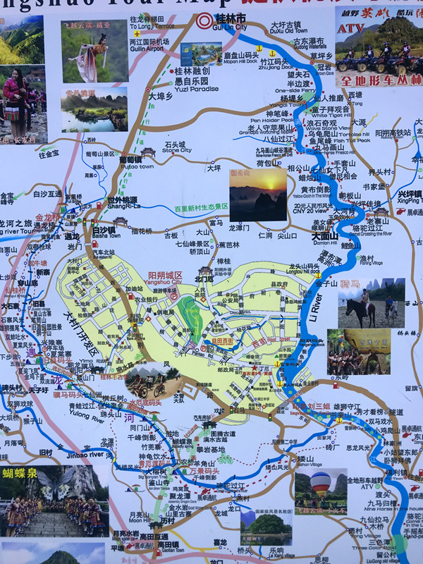 我们从龙脊梯田开高速到阳朔,本想的是顺路到杨堤送爸妈去漂流,结果来不及下午15:30就关了,就直接去了阳朔。由于中饭是近2点才吃的,一点也不饿。就办了入住,打算先去周围逛逛。本来计划今天漂流,怕回来晚,所以把印象刘三姐排到了第二个晚上,于是今晚就没事干了。