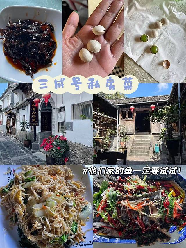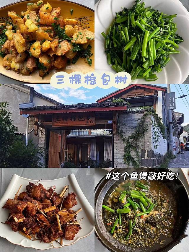 3.三棵棕包树: 环境挺大的,在野鸭湖的另外一边边上,院子里的视野不错,能看到古镇日落哦,人均50多,性价比超高。招牌火炖鱼💰58 和葱花洋芋💰18,炒时蔬💰15,吃得嘎嘎香