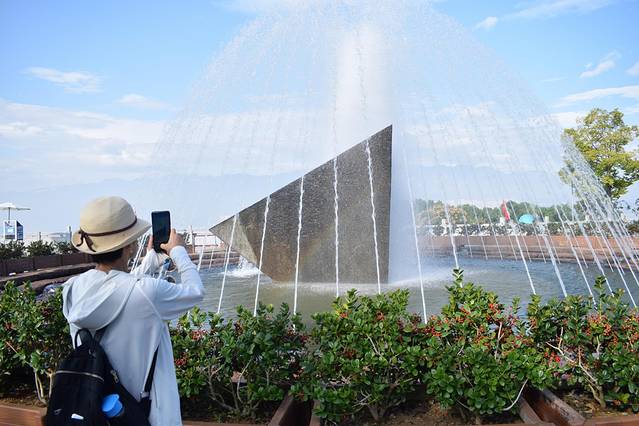 大坝截留石,在喷泉的映衬下隐约露出了彩虹。