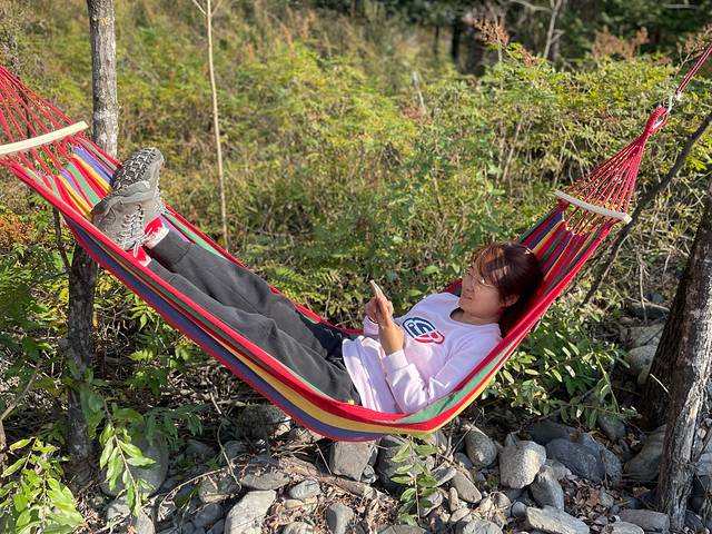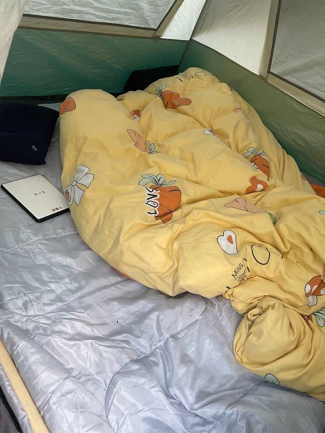 初秋山里天气冷,而且水汽大,而且帐篷小人多,整个帐篷内侧布满了水珠,真是潮的不行。唯独三实那是呼呼大睡啥都不在意😂