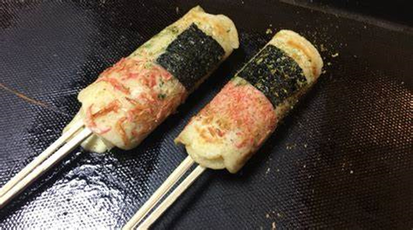会场附近有小吃摊,可以在这里吃到山形县民的灵魂食物“咚咚烧”。做法有点像煎饼果子的操作方式,摊开饼,刷酱卷鱼饼什么的,吃起来么,像章鱼小丸子的口感,价格250日元。