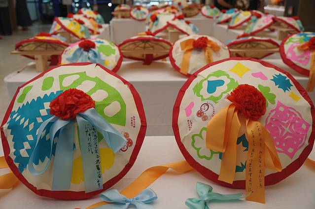 花笠节期间,S-PAL展示了许多山形市内小学的小学生制作的花笠,上边还写有稚嫩的愿望,有点七夕竹的意思。