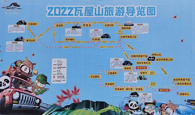 停下车观看2022年新出的瓦屋山旅游导览图,上山可乘索道,也可乘观光客车。前者登山时间短些,后者可以沿途玩些低山区的景点。我选择乘索道,是上下两段索道分别买票,下面索道是金花桥索道88元,到了金花桥索道上站的洪洞山庄,再行购买上面索道的98元的古佛坪索道,均包往返,