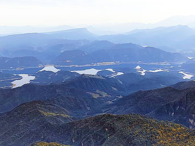 八年前的这季节,我曾来过眉山市洪雅县瓦屋山镇的雅女湖边,观望湖对面被称为最美桌山的“瓦屋山”。瓦屋山的名称来源于因地质作用形成的向东西两侧略倾的屋脊状地形,从任何角度望去,此山整体上都状若瓦屋,被地质专家认定为中国最高、最大的"方山"。当时因为景区维修和道路工程施工实行封山,没能登上山。2020年8月,修到山顶的上下两段索道正式开通,山上也建起了平坦宽畅的电瓶车道,游人可以在半小时内一次登顶游览,适合我们老年人游山的需要。这次花了半天时间游了瓦屋山,尽享雄、奇、险、秀、幽、珍于一身的中国历史文化名山的风采,算是初探,因为看到了山上正在兴建小铁路和能就近观赏世界最大落差兰溪瀑布的栈道,听说还会兴建滑雪场等,所以计划以后还会来的。