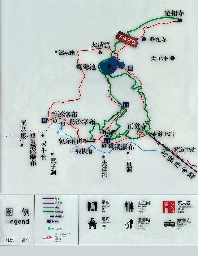 索道上站到了山顶一个道教正觉寺的地方,周围看起来一望无际,是清代人称之为的"坦荡高原",民间也称为“人间天台”的地方。正觉寺左右各有通道,分为电瓶车道和游步道两种,都通往远处的鸳鸯池和象尔山庄。