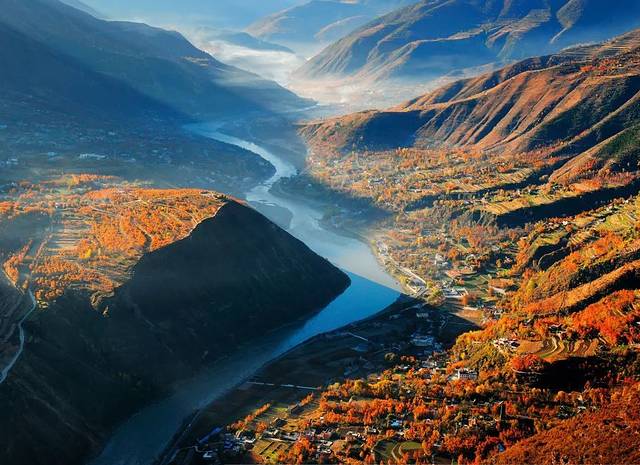 ↑清晨的金川河谷云雾缭绕,梨树红叶密集,红透了半边天,随手一拍,都称得上是最美田园秋景。