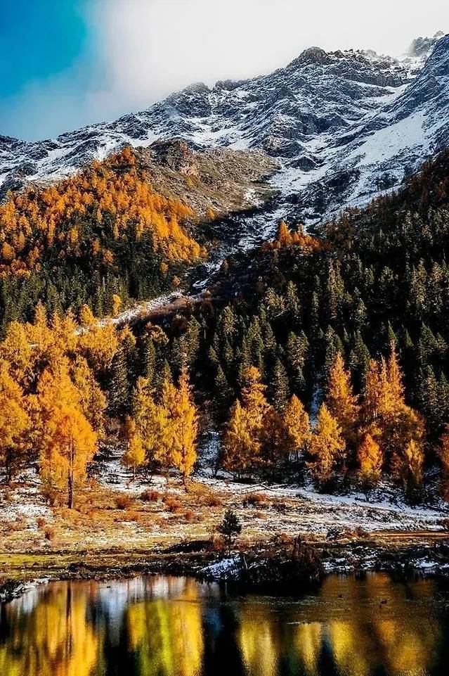 ↑四姑娘山被秋色覆盖的彩林,与山顶的皑皑白雪交错,蓝天白云之下,雪山与彩林相互依偎,极具诗情画意。