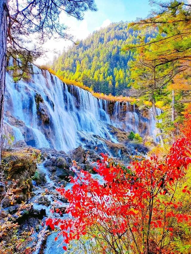 ↑九寨沟满山的树叶被染得金黄、绯红,山林将自身变换成斑斓的美景,令人沉醉其中!
