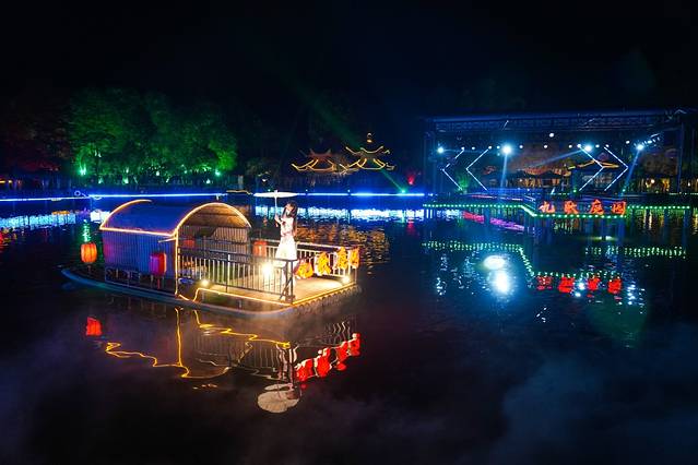 歌手坐着乌篷船在湖中演唱,有种来到 江南 水乡的感觉。