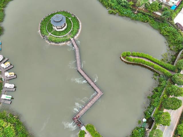 游客可以沿着田间木栈道前行,感受稻田里吹来的风,体验田园乐趣。