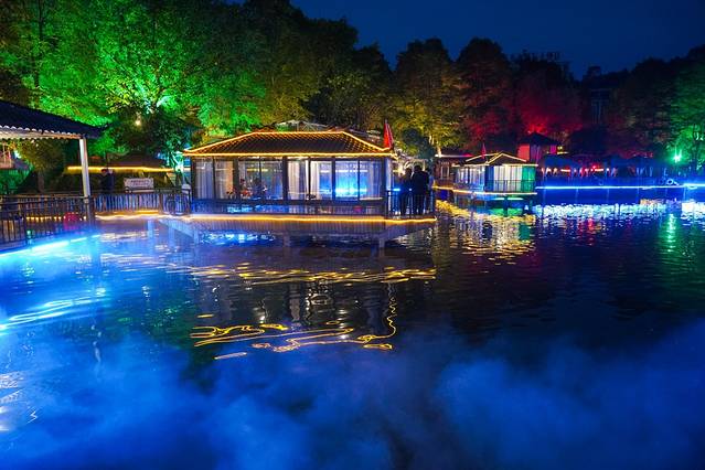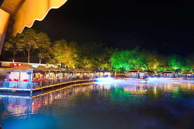 入夜后湖岸边五彩灯光亮起,大快朵颐吃火锅的同时,