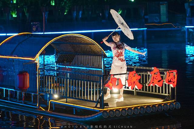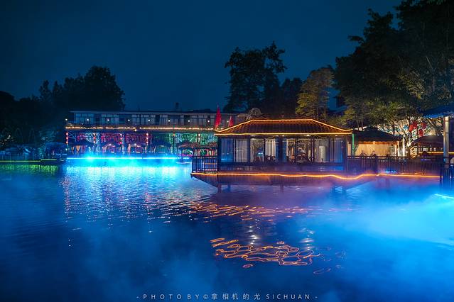 四面通透湖岸夜景风光,一览无余江南乌篷船造型的水上包厢,一艘连着一艘停泊在湖上充满了浓浓的江南风情。