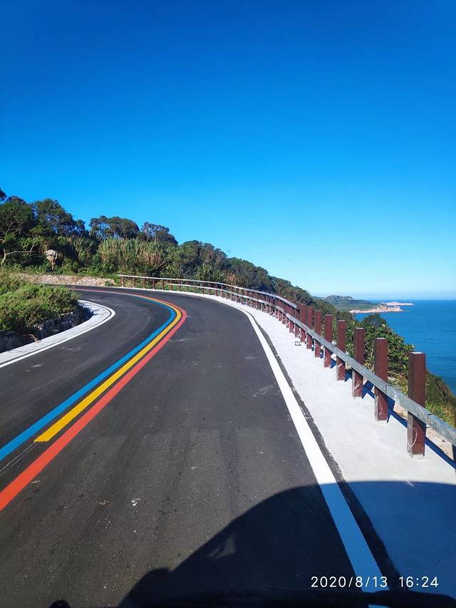 岛上标志性的三色路标线,听司机师傅吹,独创在黄色道路中心线边上增加了蓝色和红色,分别代表温州这些年开发的海岛旅游和红色旅游。