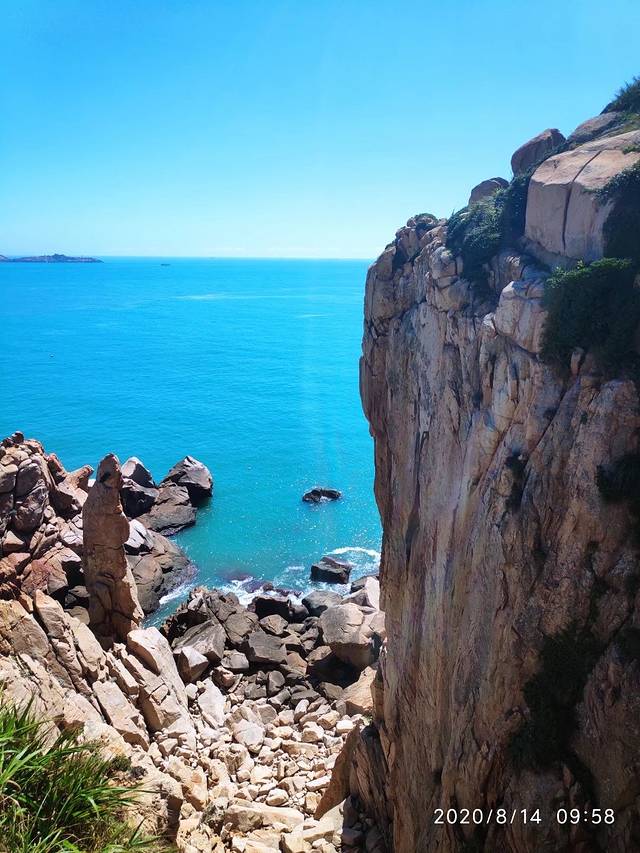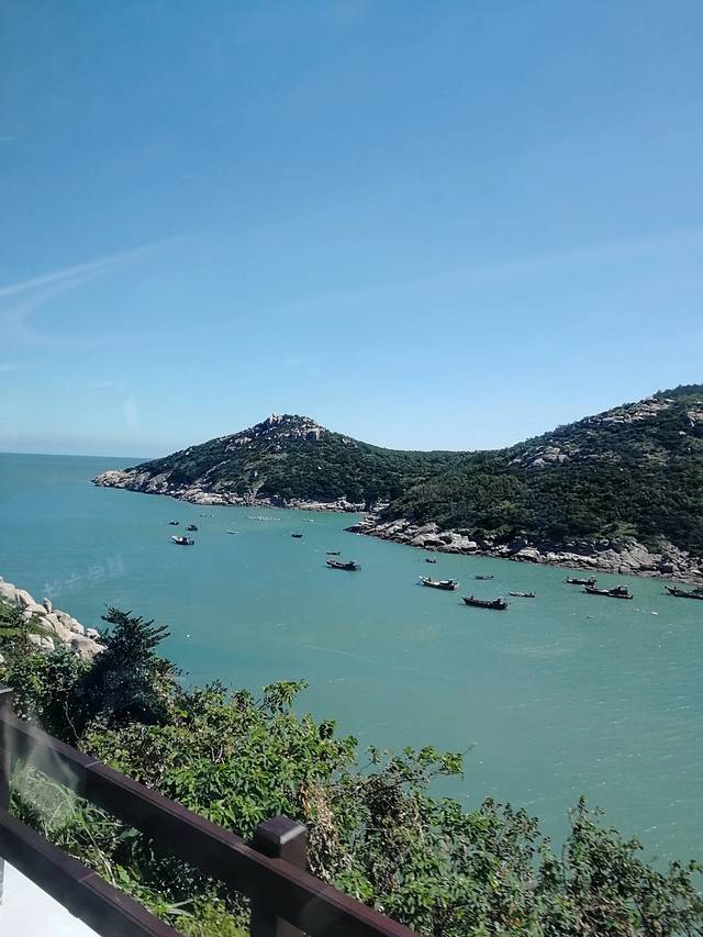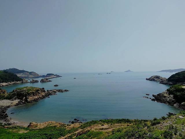 经过一番颠簸,终于上岛了,暴晒的太阳有海岛的感觉了。顺着弯弯绕绕的盘山路,巴士载着我们越怕越高,南麂岛的全貌慢慢出现在我们眼里,海边嶙峋的岩石跟舟山很像,海面上星星点点的渔船和成片的养殖网箱。