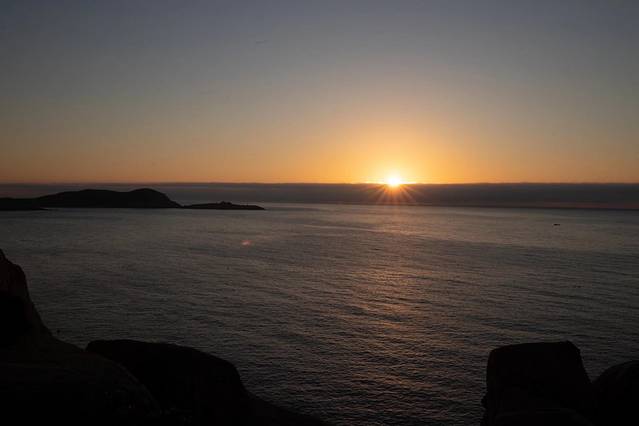 随着一阵骚动,伴随着人群中的赞叹和惊呼,天边的白有了颜色,太阳的光芒把原本遮挡住的云彩染得发红。天边得颜色也有了层次,海天交界处得海水仿佛燃烧得火焰,上方是染了色的云层,边缘有一团耀眼的光源,像是把云层挖了一个豁口。肉眼就能看见太阳的边缘了。很快,太阳就真的“跳”了出来,阳光刺破云层,投像我们这边,人们不得不眯起眼。近处的海面上倒映着一束梯形的光柱,最终收拢聚集到天际线。再后来岛上的岩石和树木也都像穿上了自己的颜色变得清晰活跃起来,海水变成了翠玉色。太阳的缓缓上升,温度也变暖和了,人们慢慢散去。
