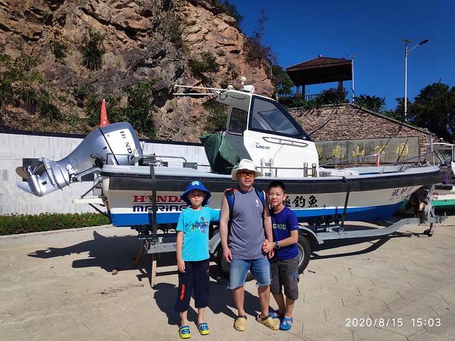 跟船老大约在正鑫海景花园对面的码头,没想到我们还先到了,找个阴凉处吹海风,孩子们对停在拖车上的快艇产生了兴趣。