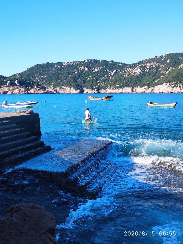 有渔民整理着渔网准备驾船出海,我寻摸着长长的台阶来到码头打望。清澈的海水翻腾着,还是清澈冰凉,光脚踩在水里冻得打颤。码头的石台上布满了藤壶,用带着的小刀一撬,就能看见壳里鲜活的贝肉,有经验的赶海人能撬一盆回家煮汤。渔民先通过浮排换乘到停在远处的渔船,启动马达驾着浪花驶出港口,又是一天的希望。孩子们都醒了,招呼他们一起站到码头的海水里,感受下冰凉。太阳光驱赶着影子,也带来了热力,受不了喽,赶紧回房间吃早饭。