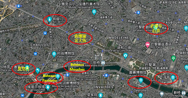 交通:到凯旋门由远及近根据自身体力选择出站,最远约为2km,地铁Concorde、Franklin D.Roosevert、George V站