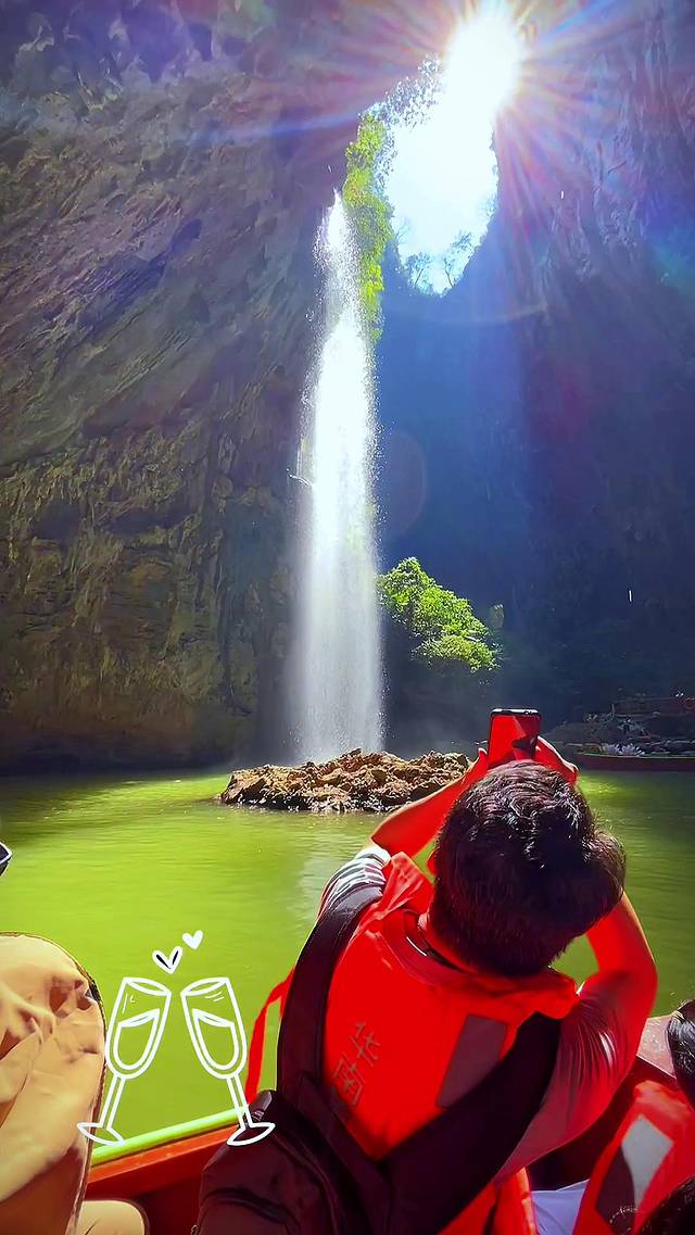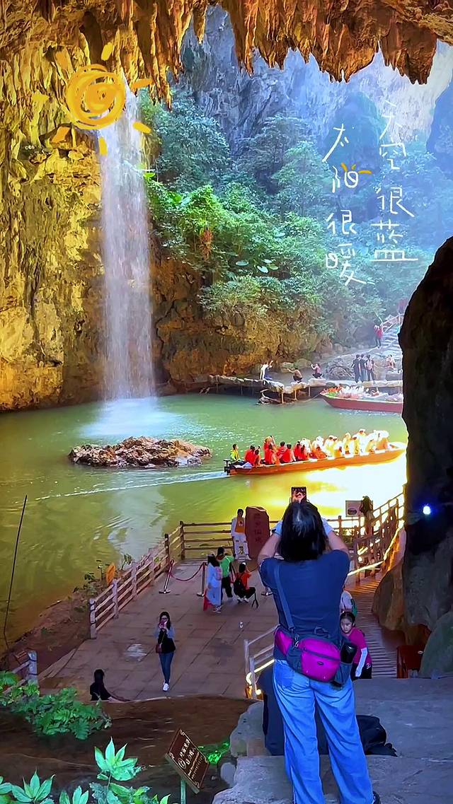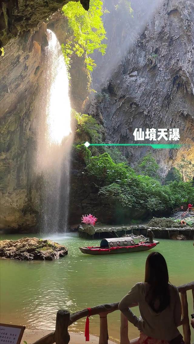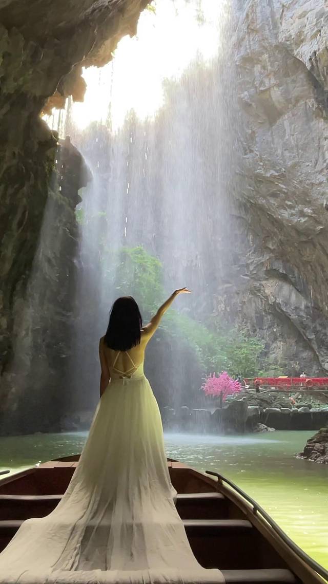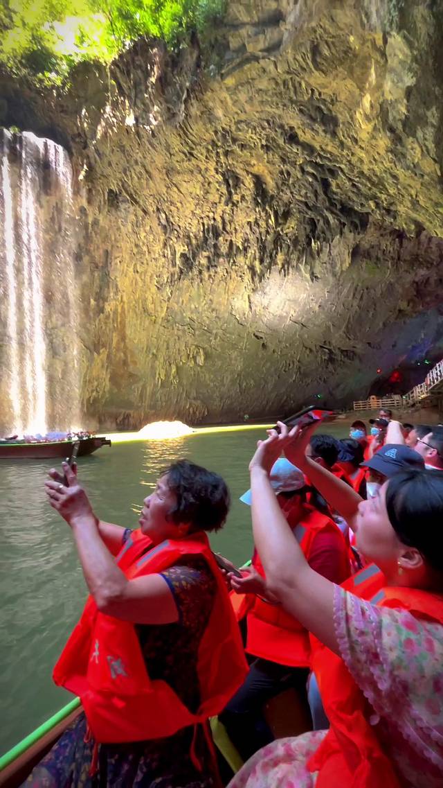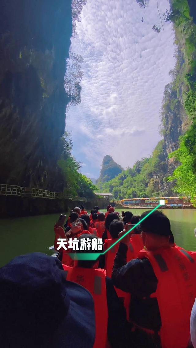 最后一站就是溶洞天坑泛舟了,来了就不能错过的游玩项目!穿洞而入,别有洞天!欣赏沿途清爽的碧绿风光,凉风迎面而来,无比舒适凉爽,时不时还有飞鸟经过,生机勃勃。途中还会经过仙境瀑布、姻缘桥、青云桥,美好祝福,福气满满!
