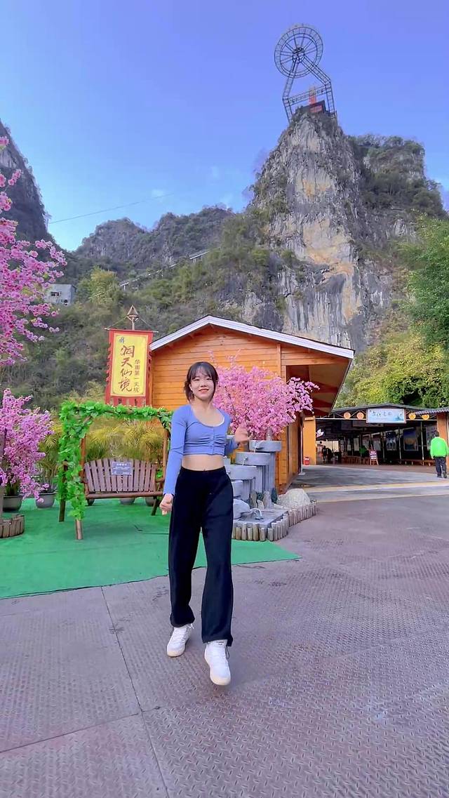 第一站先来到了秋千躺椅打卡地,盛开的桃花树,搭配石磨的流水声,坐在木制秋千上,怎么拍都好看!是来洞天仙境不可错过的一个拍照打卡点。