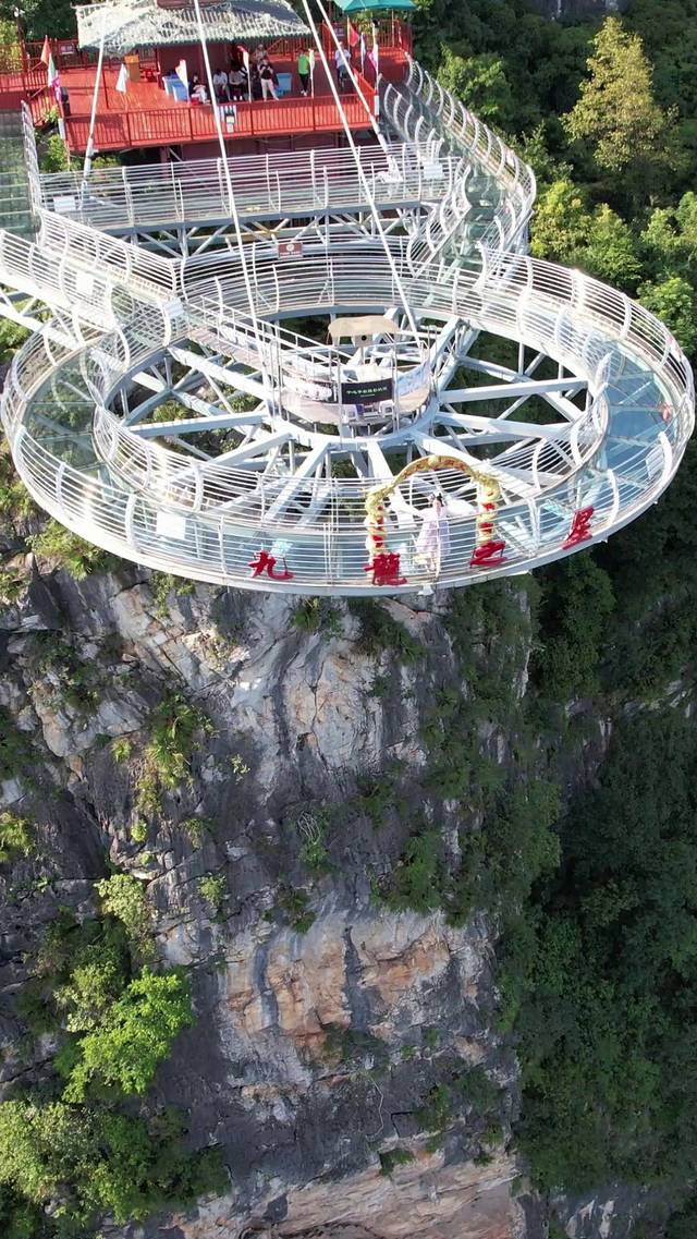 第二站通过飞天魔毯,来到了九龙之星·玻璃观景台之上。脚下是垂直高度228米的高空,透明玻璃地面,听说是目前国内观景平台垂直高度最高!您敢站上来吗?和亲朋好友一起体会英西峰林大好河山的壮丽,战胜高空挑战,一起锻炼勇气吧。