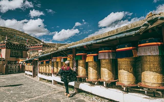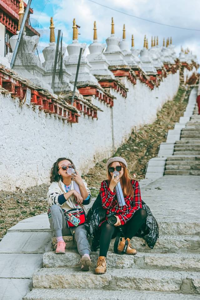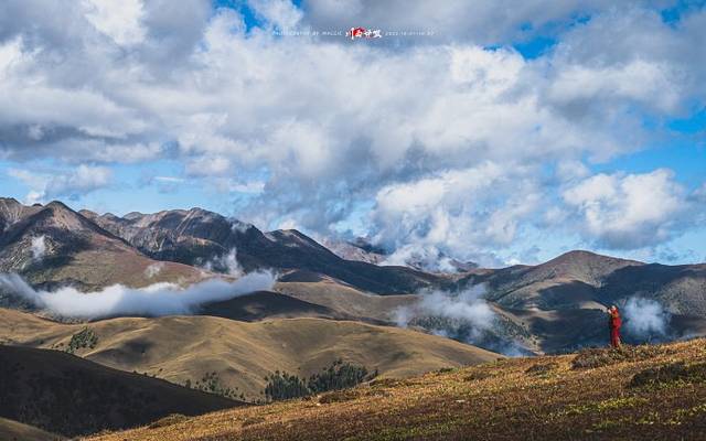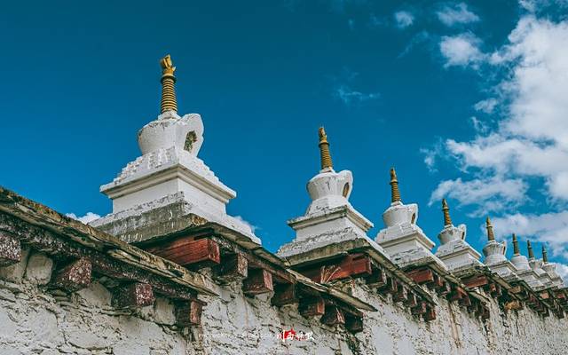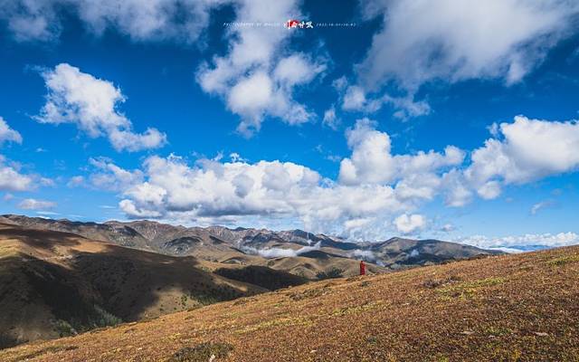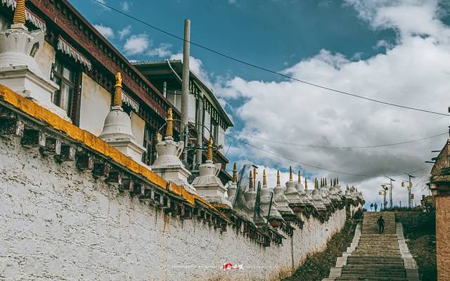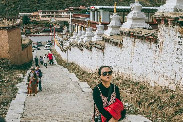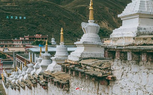 顺着右手边白塔往山上走,可以到山上去拍照,可以拍 理塘 的全景图。