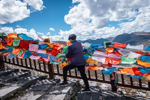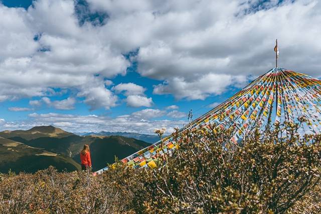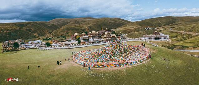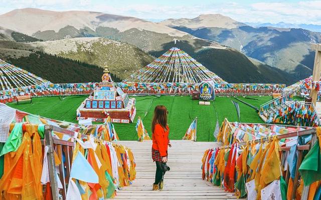 观景台向下延伸出去一片草坪,经幡塔+背后是绵延不绝的山脉,气势磅礴。