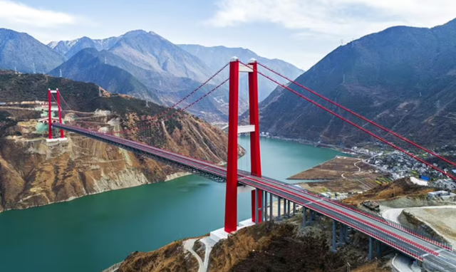大渡河大桥,主跨1100米,全长1411米。因其建设难度大,而被誉为“川藏第一桥”,世界第一的超大跨径钢梁悬索桥。矗立两岸的桥墩188米,桥面高出大渡河239米。