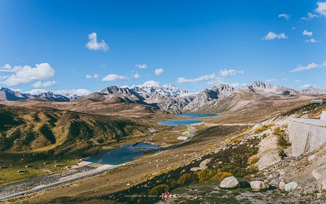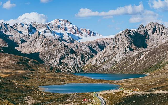 远方是白雪皑皑的雪峰,她犹如两颗镶嵌在山坳里的蓝宝石、又像雪山的两滴眼泪。