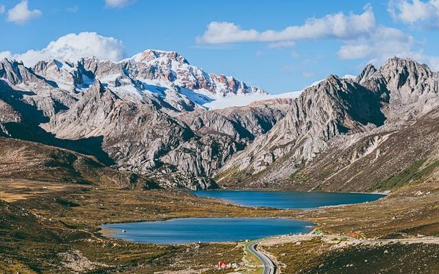 在绵延不绝的毛垭大草原间行驶,然后几个弯道过后,眼前是一段长直下坡,而道路的远端出现了两个紧挨着的海子,湖水湛蓝如洗、深邃纯净……这是姊妹湖啊。
