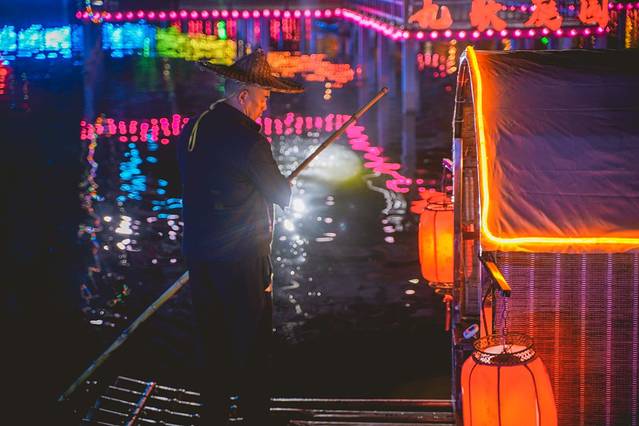 我们用餐的地方是在船上,夜幕降临,美轮美奂的灯光亮起,四周便幻化出迷人的景观,彷佛置身若隐若现的雾海中,非常浪漫。
