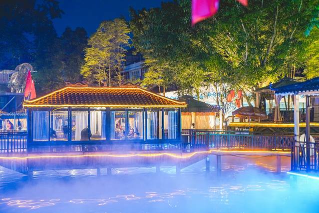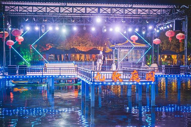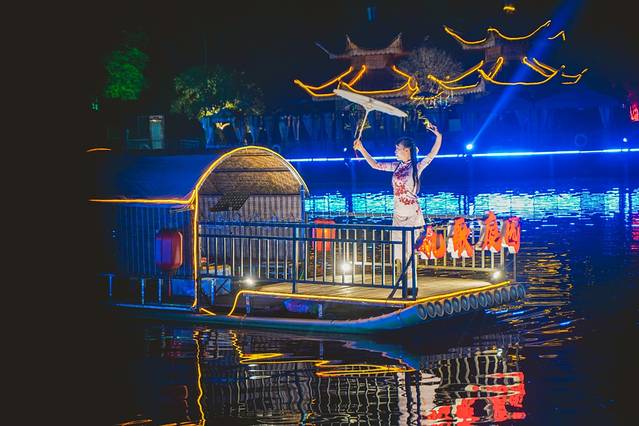 晚上吃饭时对面的舞台还有歌舞表演,在 江南 乌篷船造型的水上包厢里大快朵颐吃火锅的同时,还能看风景观赏湖上的歌舞剧和四周的音乐喷泉,真的好不惬意。