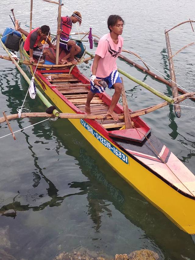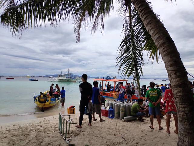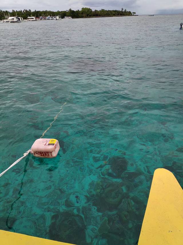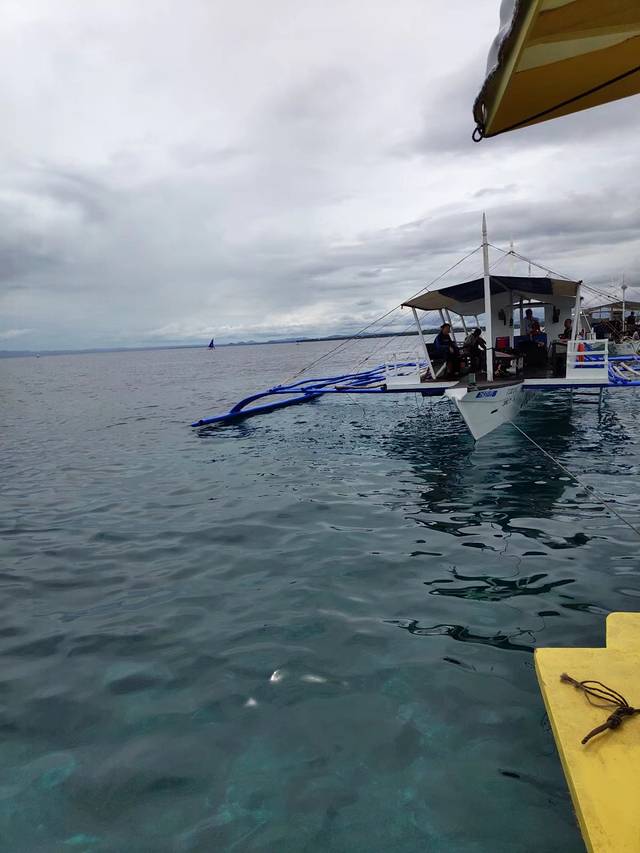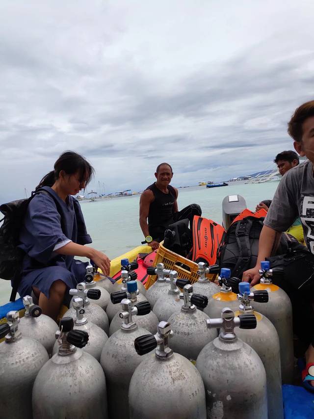 正当大家满怀期待陆续登船,准备出发的时候。发生了意外,开船的劳工因为下水推船,没留神脚被引擎螺旋桨打伤了,全船都儍了,还是潜导经验丰富,拿了条丝巾就给包裹上了,看着船员痛苦的表情,没敢去看伤口,据说流了不少血。一帮岸上的当地人赶紧把伤员拉上汽车,送到了医院。我们先登上了人工浮岛,等待着潜导从医院回来。浮岛周围都是停靠的螃蟹船,这个潜点成了这种天气下的热门,潜水的安全性就显得尤为重要了。水质很好,使得对水下的景物很期待。我跟着一对广东父子一组,孩子10岁左右,是来考OW的,潜导负责照顾他,他爸就成了我的buddy。