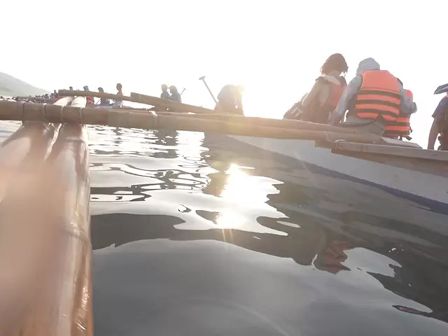 我们的船渐渐驶离了岸边,不一会,随着远处船上人们的尖叫,我们也开始撑起脖子向前张望。外圈的游客在惊叹得站起身来拍照,内圈划着小船的的工作人员沿着游船行进的线路不断的抛喂食物,空气中都充满着饵料的腥臭味。