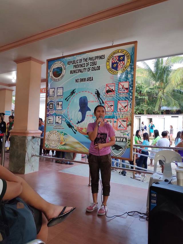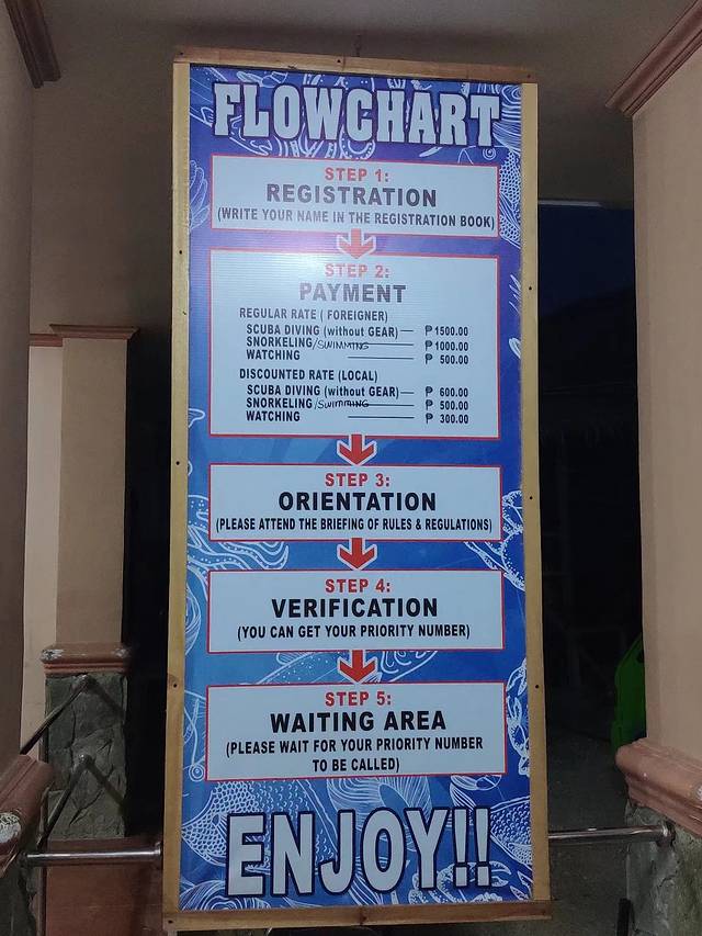 景区的入口已经簇拥了不少游客了,大厅是有个展板的,上面描述了鲸鲨参观的注意事项。当地的宾馆服务几乎都涵盖了接送和帮助排队购票的服务,当然这些都是要付费的,也很便宜。等候大厅休息的时候,会有工作人员循环讲解观看鲸鲨的一些要求。票价除了成人与儿童的区别,还有船上干看和水中近距离接触的差异。