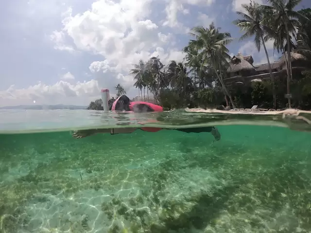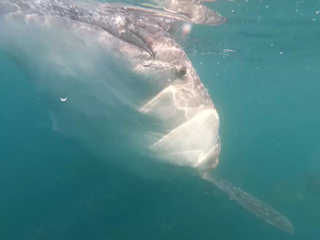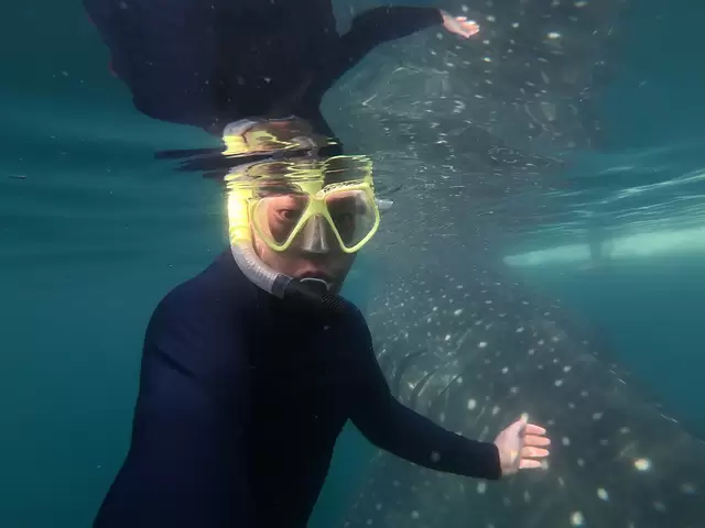 带上面镜,潜入水中。当视线沉入水面,不远处那个满身斑点的大鱼正在慢慢的向我们游来,海水隔离了游客的喧闹,脚下是深蓝的海底,面前就是我和一条4,5米长的大鱼,感觉就像在探索宇宙。原本设想的第一次见面应该是这个样子的舒展。结果看见这个庞然大物后,词穷啊,一句“卧槽”紧张死。