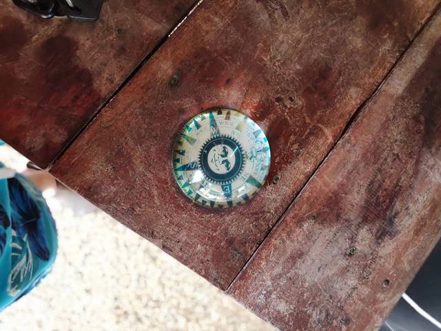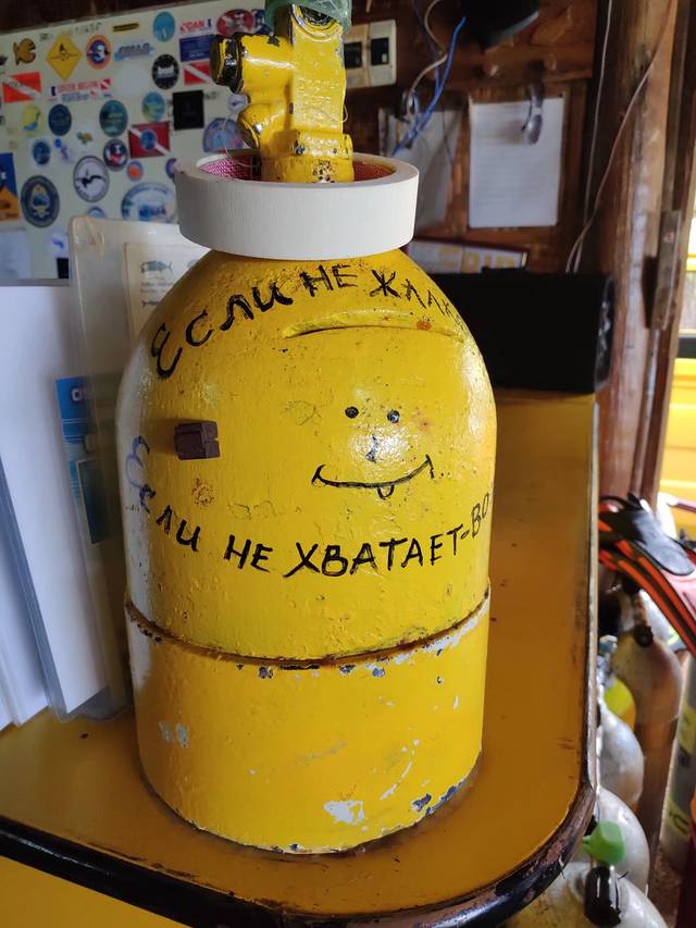面对着波涛汹涌的大海,真是捉急。8点半,人员陆陆续续到达,一队国人也是一路,去不了巴里卡萨,只能去近海的17号潜点DolJo。门口的大黄也算是老潜水长了,柜台上的捐款箱很有造型,气瓶的摸样。桌上的粘着一个指南针。九点钟,大家上车出发,一个跟五菱宏光摸样的改装货车拉上了我们七七八八是几个人,潜导只好挤到了车顶上。