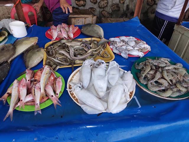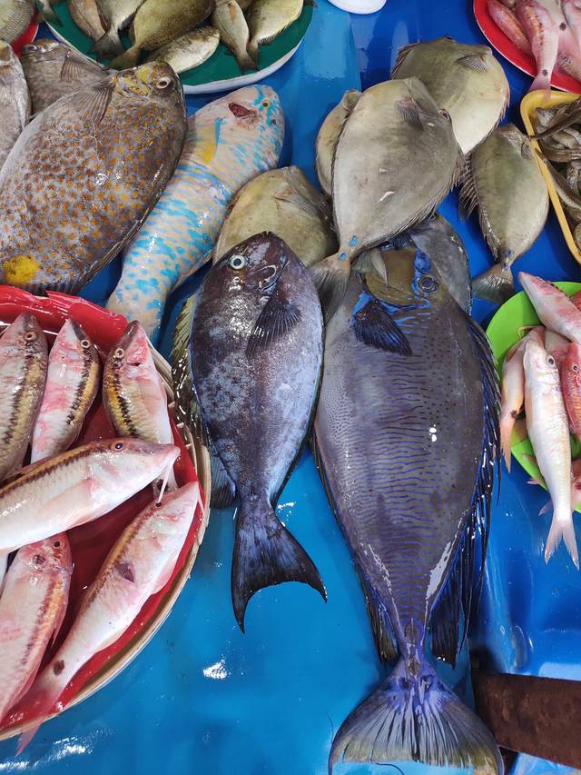 市场紧挨着码头,随着远处忙“哒哒哒哒”刺耳的马达声,忙碌了一晚上的渔民带着疲惫和渔获靠岸了。看着向翘首的鱼贩子说着什么就知道,应该收获还不错。